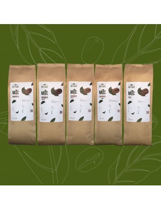 Bộ cà phê thuần hạt nguyên chất rang mộc gồm: Mộc Robusta, Mộc Culi, Mộc Arabica rang vừa, Mộc Arabica rang đậmMộc Arabica Decaf.